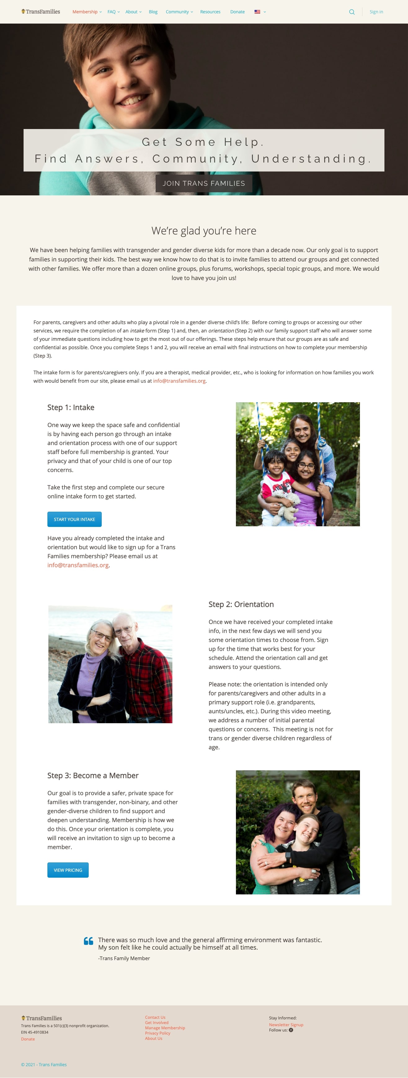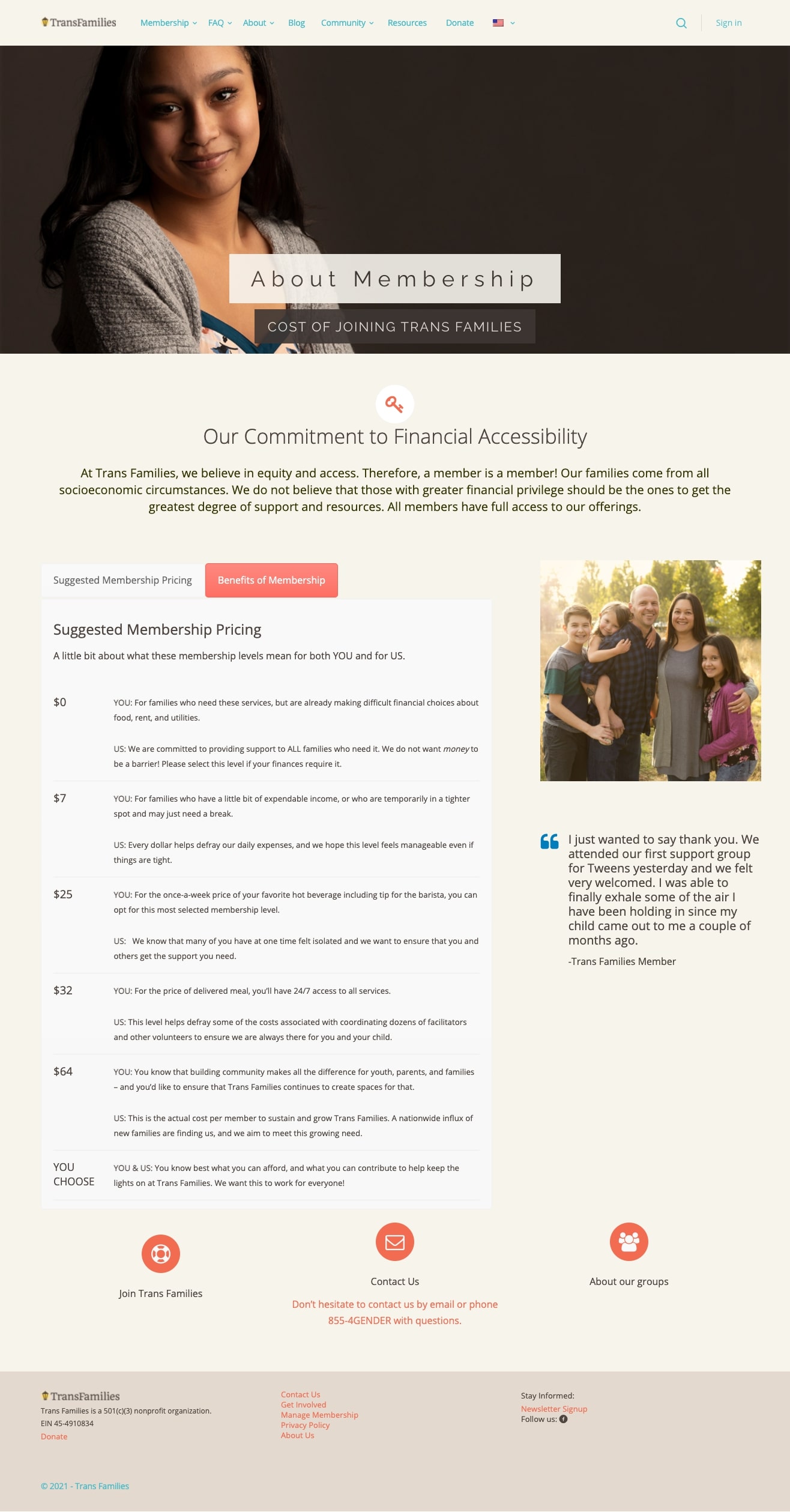THE WORK: In order to better understand the organization, we started our work with 1:1 interviews of the leadership team. The goal of these interviews was to gather the organization’s mission and vision, objectives and goals for the near future, the makeup of their membership and administrative and organizational hurdles with their current funding model. After gathering information about the organization and their members, we conducted secondary research on membership models. Due to the fact that Trans Families has always been conscious of the barriers to their services, they were intrigued by the recent movement of choose-what-you-pay models. We evaluated 5 companies in 4 different industries that employed flexible pricing models and presented the benefits to each model along with our recommendations to the Trans Families leadership team. After gathering feedback, we then built a custom model for Trans Families and working with their web team, we designed and implemented a new membership page to launch the program.